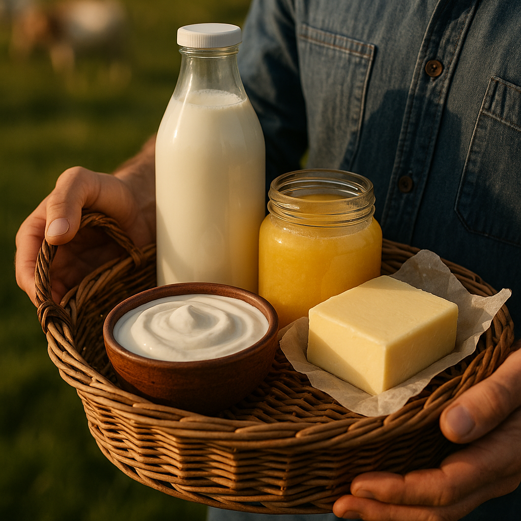 Explore our range of fresh, organic dairy products, crafted with care from healthy cows and buffaloes. From creamy milk to rich butter, golden desi ghee, and smooth yogurt, every product delivers purity, nutrition, and authentic farm-to-table goodness.
